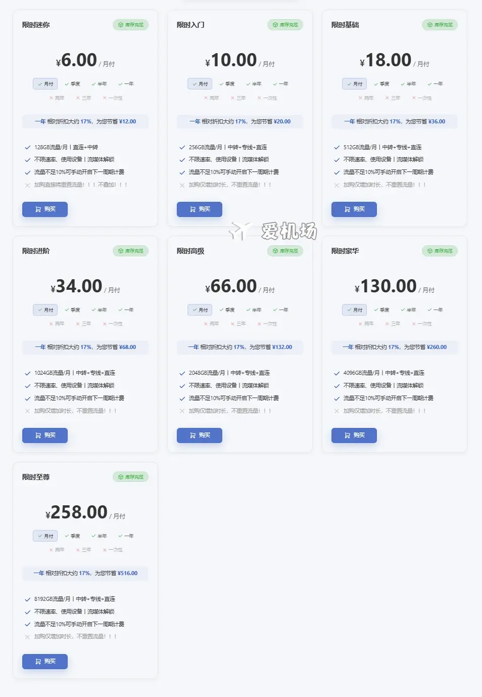 支持月付,套餐设置简单,月付套餐最低 ¥6/月起,限时迷你套餐,不包含专线节点。其他套餐都是全节点,年付有一定幅度优惠,同时有按量付费流量包提供。