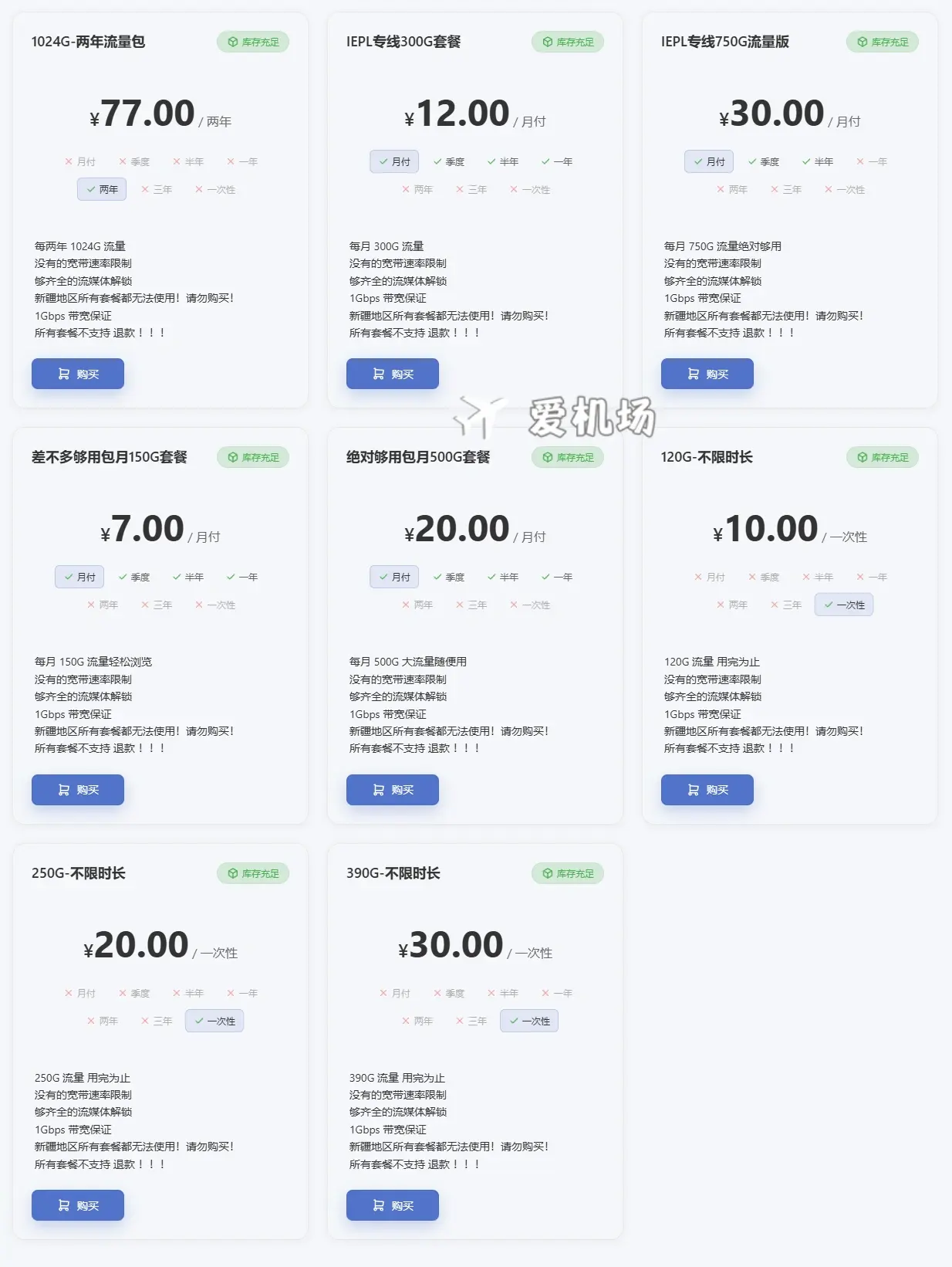 养鸡场支持月付,月付套餐最低 ¥7/月起,年付有一定幅度优惠。同时有不限时按量付费流量包和限时2年的 1024G流量包的方案。