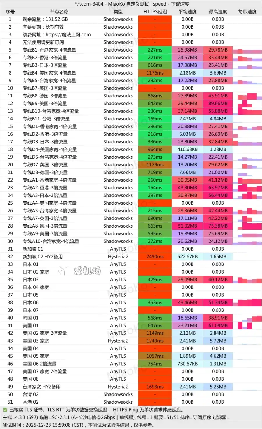 节点可用性勉强凑合,属于能用就行的那一类,日常使用,需要手动挑选节点来用,高倍率的节点的表现多数都还不错,普通 1x 倍率节点(也就是没有标注流量倍率的)可用性则相对较差。