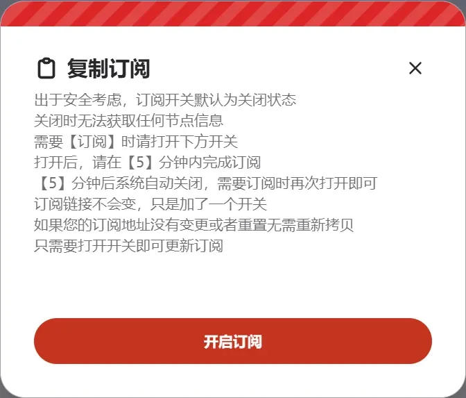 机场已开启订阅限制,加了订阅开关和订阅链接的阅后即焚,订阅链接仅 5 分钟可用时限。